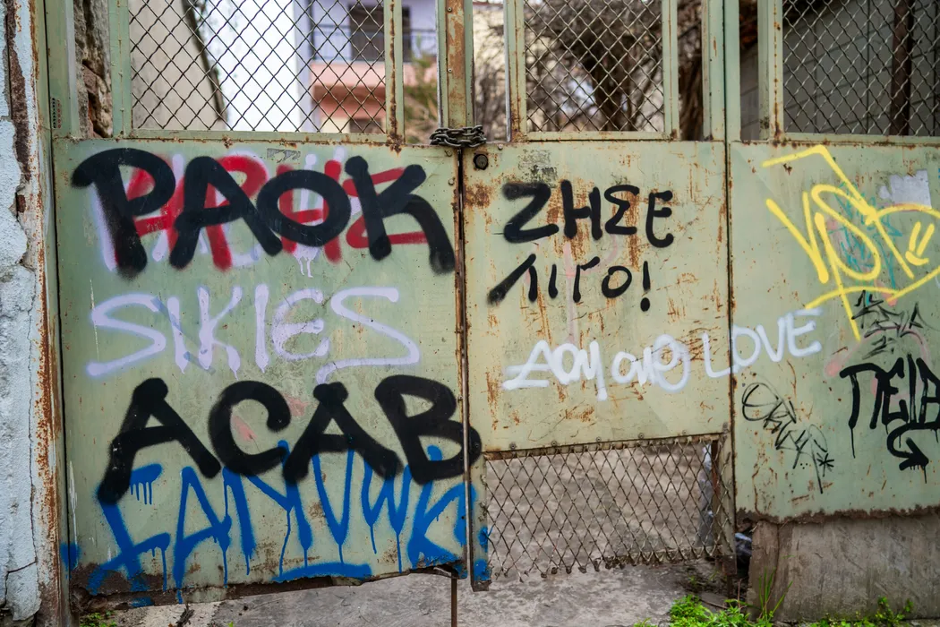 Rivalitatea dintre cele trei echipe din Salonic, descrisă în arta urbană de ultrașii greci. FOTO