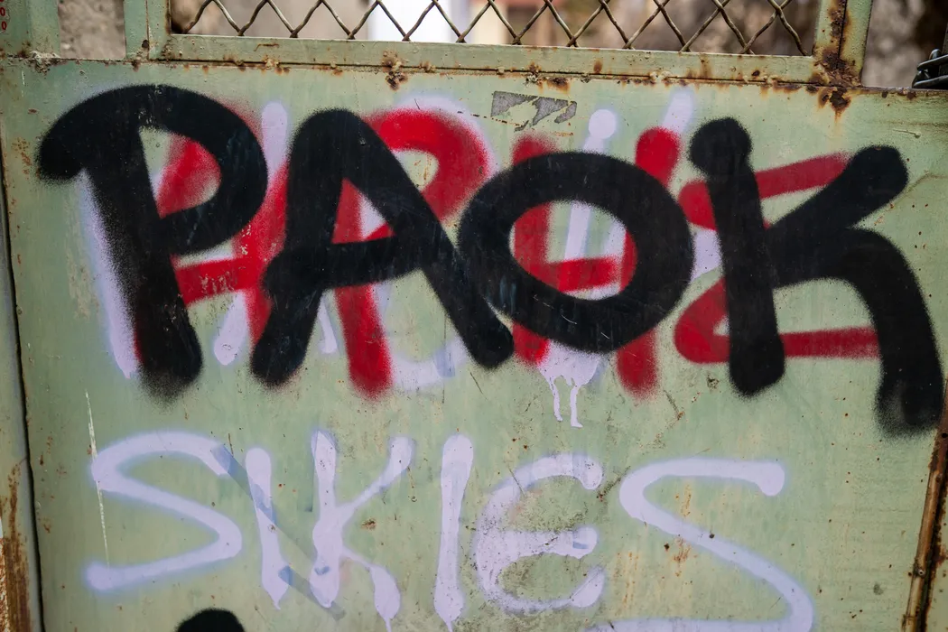 Rivalitatea dintre cele trei echipe din Salonic, descrisă în arta urbană de ultrașii greci. FOTO