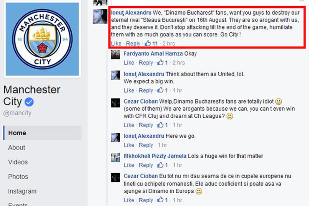 Rivalitatea Steaua – Dinamo s-a mutat pe Facebook-ul lui Manchester City. Un dinamovist le cere englezilor să o bată la scor pe Steaua: „Distrugeți-i, umiliți-i, deoarece sunt foarte aroganți cu noi și o merită!”