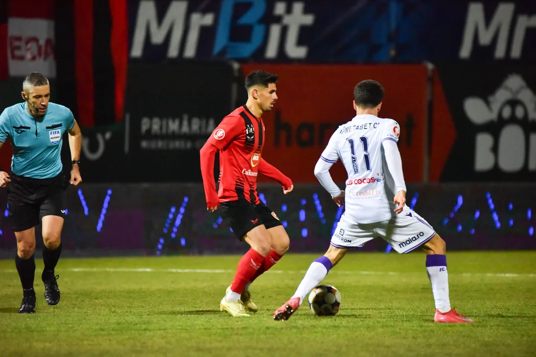 Arbitrul central Radu Petrescu si Francisco Anderson Ceará in meciul de fotbal dintre FK Csikszereda Miercurea Ciuc si FC Arges, contand pentru Superliga Superbet, desfasurat pe Stadionul Municipal din Miercurea Ciuc, sambata 6 decembrie 2025. © FOTO:Zoltan Pal/SPORT PICTURES