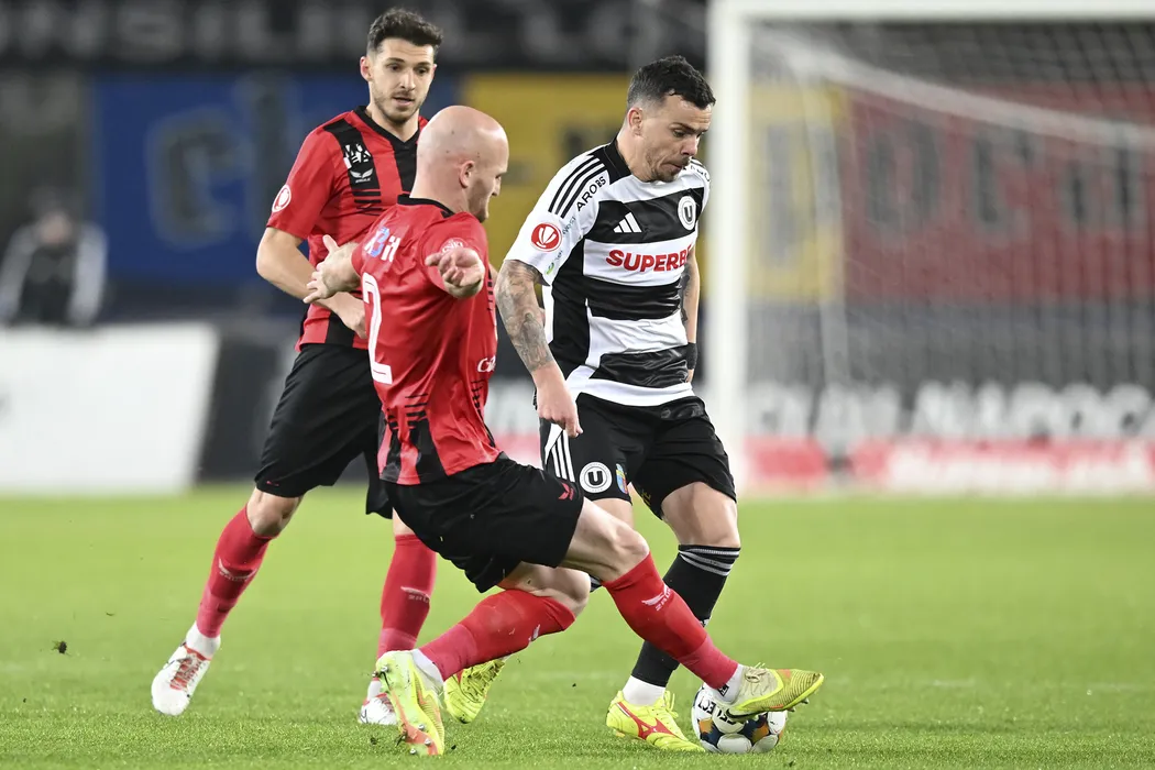 Dan Nicolae Nistor si Arian Kabashi, Szilárd Veres in meciul de fotbal dintre FC Universitatea Cluj si FK Csikszereda Miercurea Ciuc, contand pentru Superliga Superbet, desfasurat pe Cluj Arena din Cluj-Napoca, sambata 14 februarie 2026. © FOTO:Flaviu Buboi/SPORT PICTURES