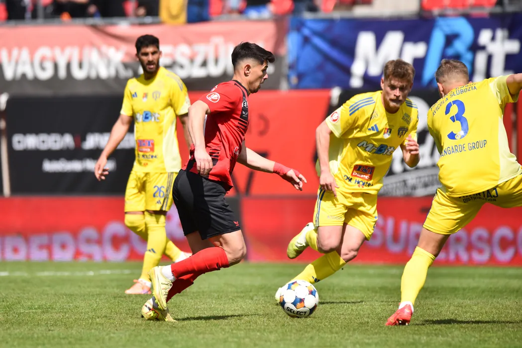 Francisco Anderson Ceará si Vlad Marian Pop in meciul de fotbal dintre FK Csikszereda Miercurea Ciuc si AFC Unirea 04 Slobozia, contand pentru Superliga Superbet Play-Out, desfasurat pe Stadionul Municipal din Miercurea Ciuc, sambata 18 aprilie 2026. © FOTO:Zoltan Pal/SPORT PICTURES