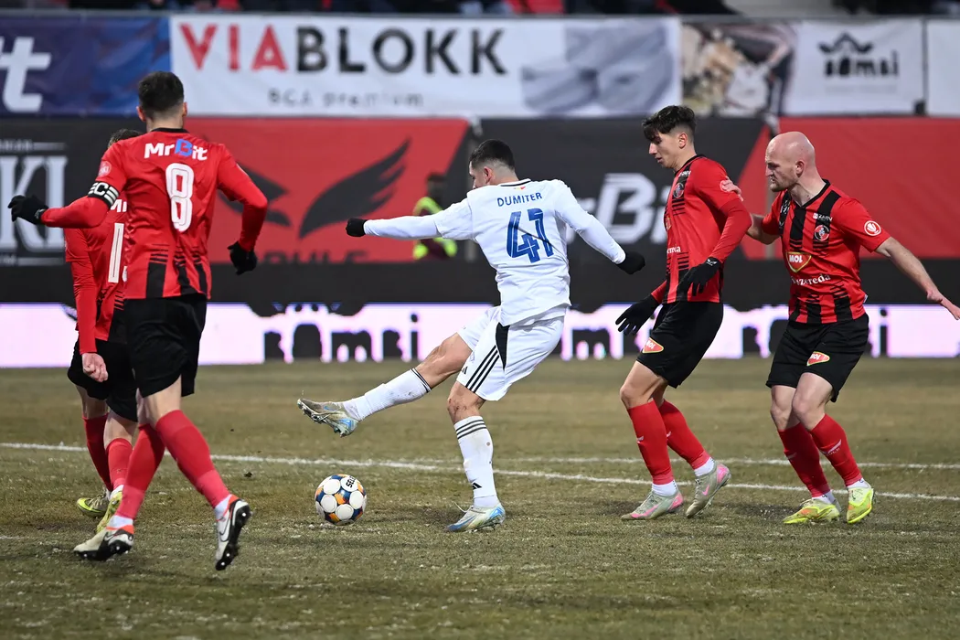 Arian Kabashi, Efraim Zoltán Bödő si Ioan Andrei Vasile Dumiter in meciul de fotbal dintre FK Csikszereda Miercurea Ciuc si FC Botosani, contand pentru Superliga Superbet, desfasurat pe Stadionul Municipal din Miercurea Ciuc, duminica 18 ianuarie 2026. © FOTO:Tudy/SPORT PICTURES
