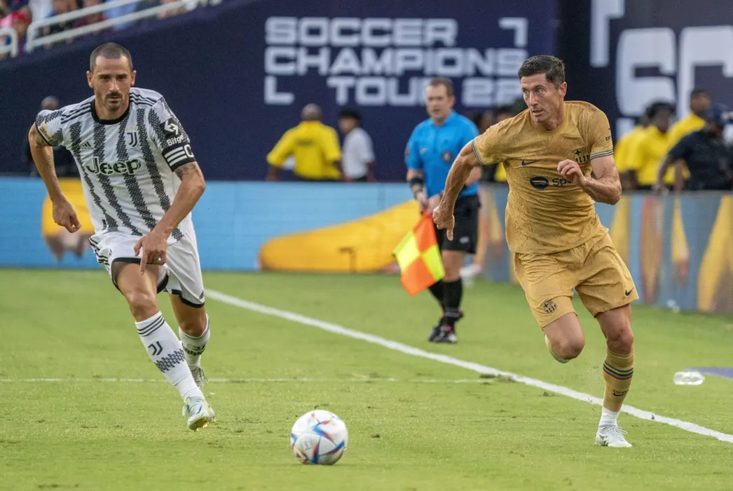 Barcelona forward Robert Lewandowski dribbles past Juventus defender Leonardo Bonucci during the first half of a soccer match at the Cotton Bowl, Tuesday, July 26, 2022 in Dallas. The game ended in a 2-2 draw. (AP Photo/Jeffrey McWhorter)