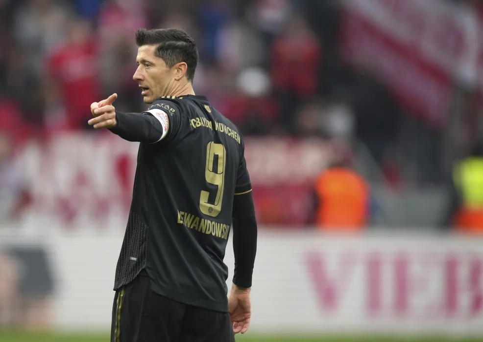Bayern's Robert Lewandowski after scoring his sides first goal during a German Bundesliga soccer match between FSV Mainz 05 and Bayern Munich in Mainz, Germany, Saturday, April 30, 2022. Lewandowski set a new record for most single-season away goals. (AP Photo/Michael Probst)