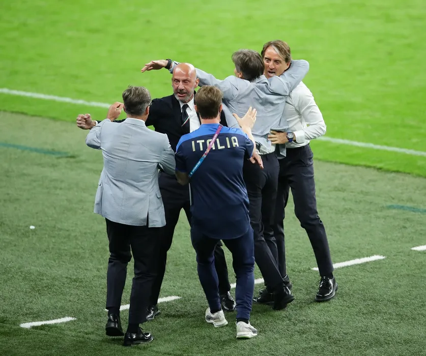 June 26, 2021, London, United Kingdom: London, England, 26th June 2021. Gianluca Vialli, Roberto Mancini, Gabriele Oriali celebrates their second goal during the UEFA European Championships match at Wembley Stadium, London. Picture credit should read: David Klein / Sportimage,Image: 618063635, License: Rights-managed, Restrictions: , Model Release: no