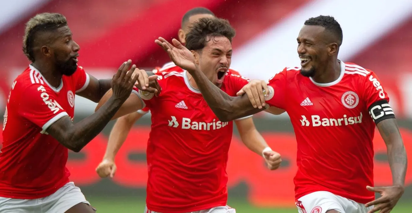 Abel Hernández of Internacional celebrates his penalty goal with Rodinei and Maurício in the 98th minute 2-1; Beira-Rio Stadium, Porto Alegre, Brazil; Brazilian Serie A, Internacional versus Gremio.