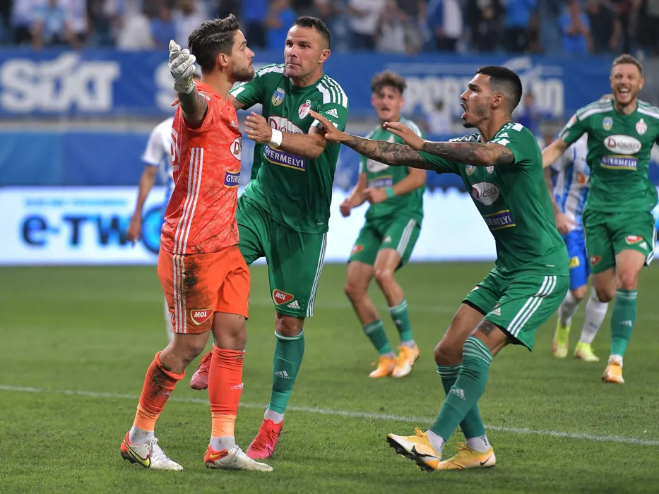 Roland Csaba Niczuly se bucura dupa ce a aparat un penalty alaturi de Adnan Aganovic si Hugo Felipe Goncalves Martins De Sousa in meciul de fotbal dintre Universitatea Craiova si Sepsi OSK Sfantu Gheorghe, contand pentru Liga 1 Casa Pariurilor, desfasurat pe Stadionul Ion Oblemenco din Craiova, luni 13 septembrie 2021. © FOTO:Razvan Pasarica/SPORT PICTURES