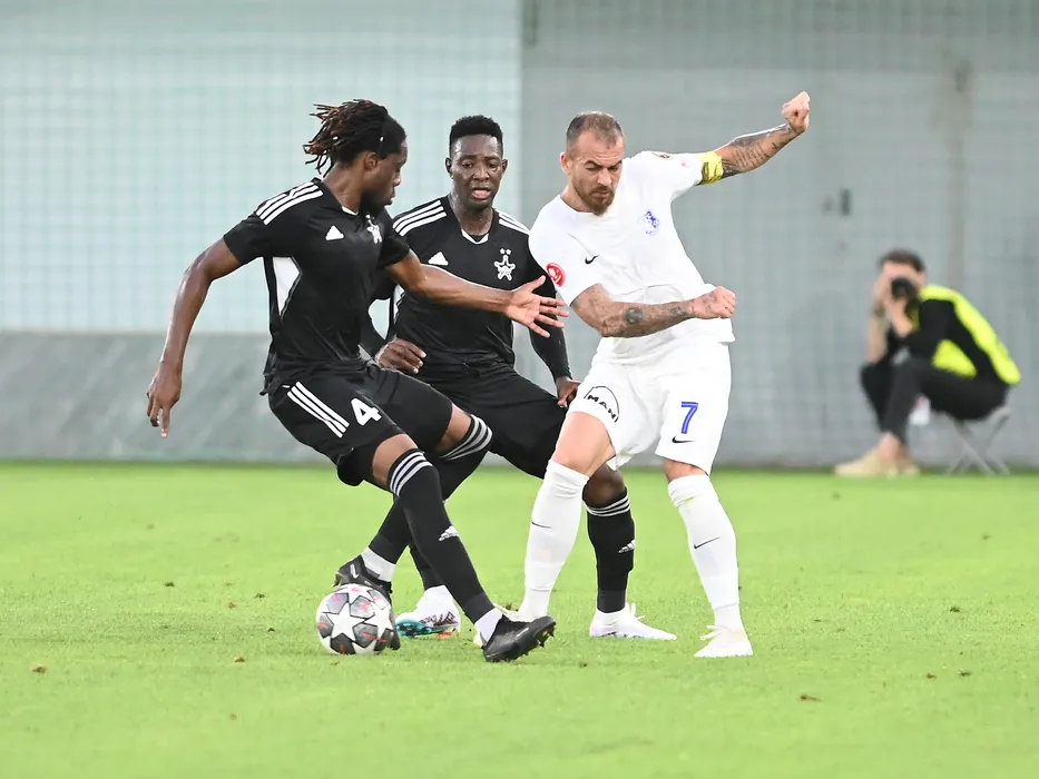 Munashe Garananga, Moussa Kyabou si Denis Alibec in meciul de fotbal dintre FC Sferiff Tiraspol si FCV Farul Constanta, din cadrul Preliminariilor Ligii Campionilor, desfasurat pe Stadionul Sheriff din Tiraspol, marti 18 iulie 2023. © FOTO:Razvan Pasarica/SPORT PICTURES