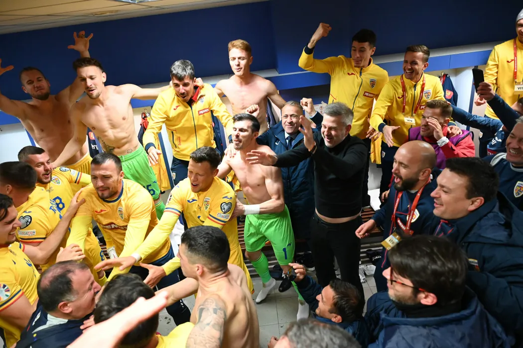 Fotbalistii romani Răzvan Marin, Alexandru Cicaldau, Ionut Radu, Viorel Artean, Vasile Mogos, Adrian Rus, Vasile Mogos, Florin Nita, Bogdan Racovitan, Mihai Stefanescu si antrenorul Edward Iordanescu se bucura in vestiar dupa calificarea obtiunta in urma meciul de fotbal dintre Israel si Romania, din cadrul preliminariilor Campionatului European 2024, desfasurat pe Puskás Akadémia Pancho Aréna din Felcsut, sambata 18 noiembrie 2023. © FOTO:Razvan Pasarica/SPORT PICTURES