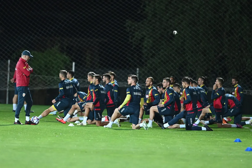 Fotbalistii romani printre care Mario Camora, Deian Sorescu, Denis Alibec, Alexandru Cicâldău, Andrei Cordea si Nicușor Bancu alaturi de antrenorul lor Edward Iordanescu la antrenamentul oficial de dinaintea meciului impotriva Bosniei Hertegovina, contand pentru Liga Natiunilor, desfasurat la Centrul National de Fotbal din Mogosoaia, duminica 25 septembrie 2022. © FOTO:Razvan Pasarica/SPORT PICTURES