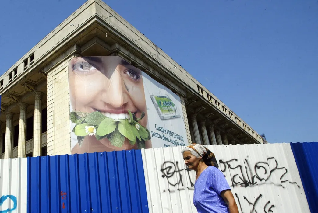 A pedestrian walks 20 June 2006 past the uncompleted House of Radio, built under the communist regime of Romanian dictator Nicolae Ceausescu, in Bucharest. The capital of Romania is preparing for major renovation with 39 boulevards being rebuilt, a new subway line linking the Henri Coanda international airport to the city and a suspended bridge near the main railroad station being planned in an attempt to transform Bucharest into a European city.,Image: 18473630, License: Rights-managed, Restrictions: TO GO W/ Roumanie-transports-infrastructures, Model Release: no, Credit line: DANIEL MIHAILESCU / AFP / Profimedia