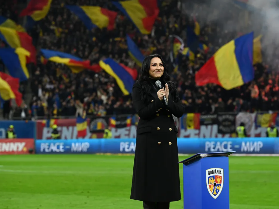 Andra canta imnul national la meciul de fotbal dintre Romania si Elvetia, din cadrul preliminariilor Campionatului European 2024, desfasurat pe Arena Nationala, marti 21 noiembrie 2023. © FOTO:Razvan Pasarica/SPORT PICTURES