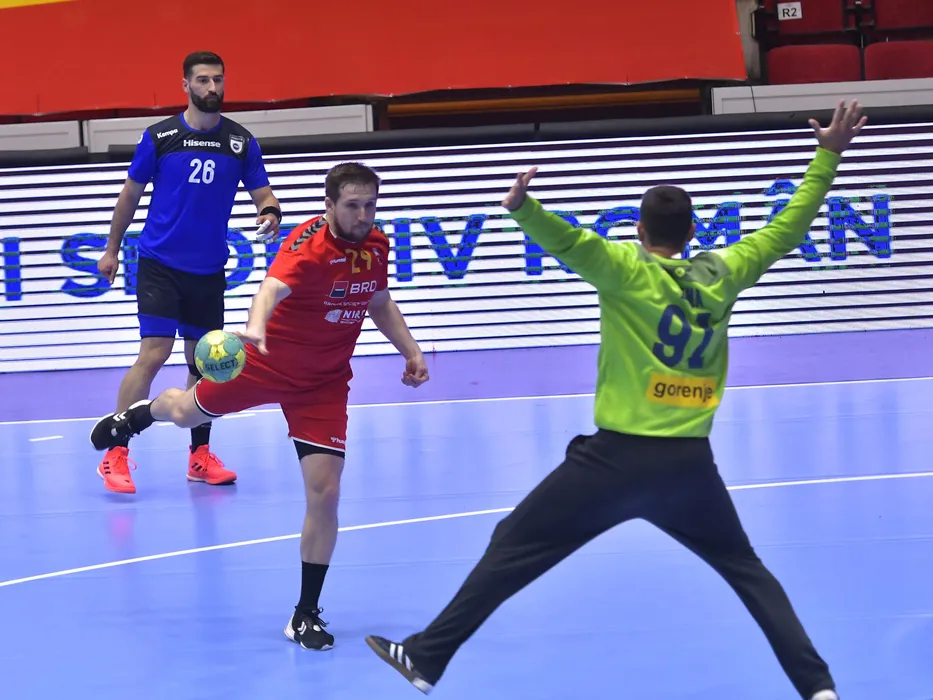 Drilon Tahirukaj si Nicusor Andrei Negru in meciul de handbal masculin dintre Romania si Kosovo, contand pentru Preliminariile CE 2022, desfasurat fara spectatori in Sala Ion Kunst Ghermanescu-Polivalenta din Bucuresti, duminica 14 martie 2021. © FOTO:Razvan Pasarica/SPORT PICTURES