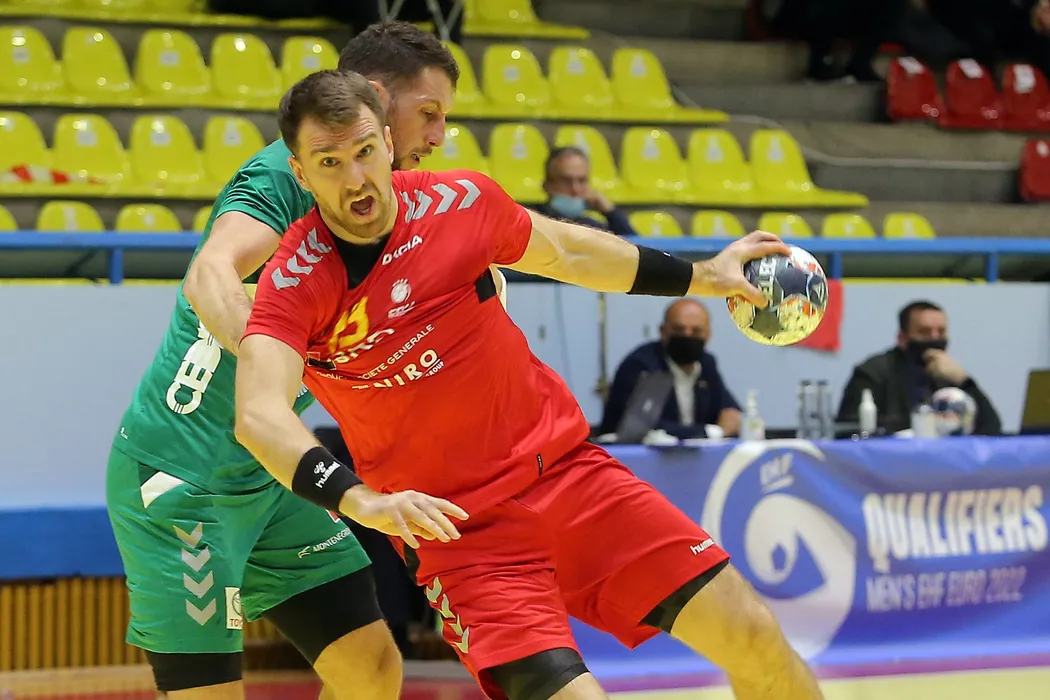 Radu Cristian Ghita (D), de la nationala de handbal a Romaniei, arunca la poarta in timpul meciului contra selectionatei Muntenegrului din preliminariile Campionatului European de Handbal 2022, disputat in sala Lascar Pana din Baia Mare. MIRCEA ROSCA / MEDIAFAX FOTO