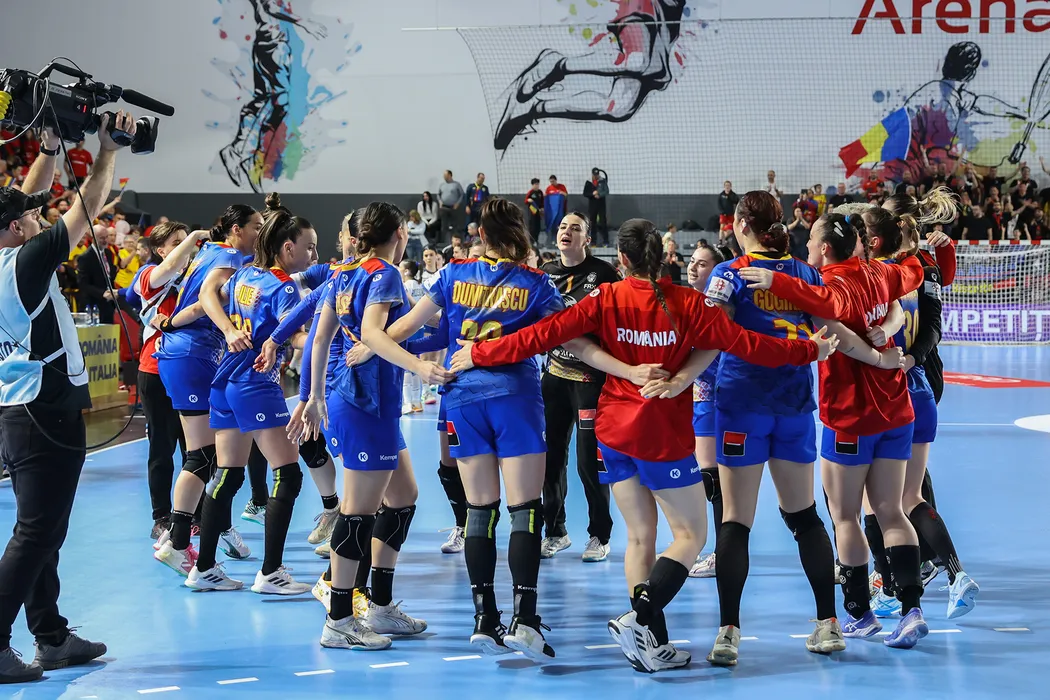 Handbalistele tricolore se bucura dupa victoria obtinuta in meciul de handbal dintre Romania si Italia, ccontand pentru calificarea la Campionatul Modial de handbal feminin din 2025, desfasurat in Sala Polivalentă Teraplast Arena din Bistrița, duminica 13 aprilie aprilie 2025. © FOTO: Sorin Pana/SPORT PICTURES