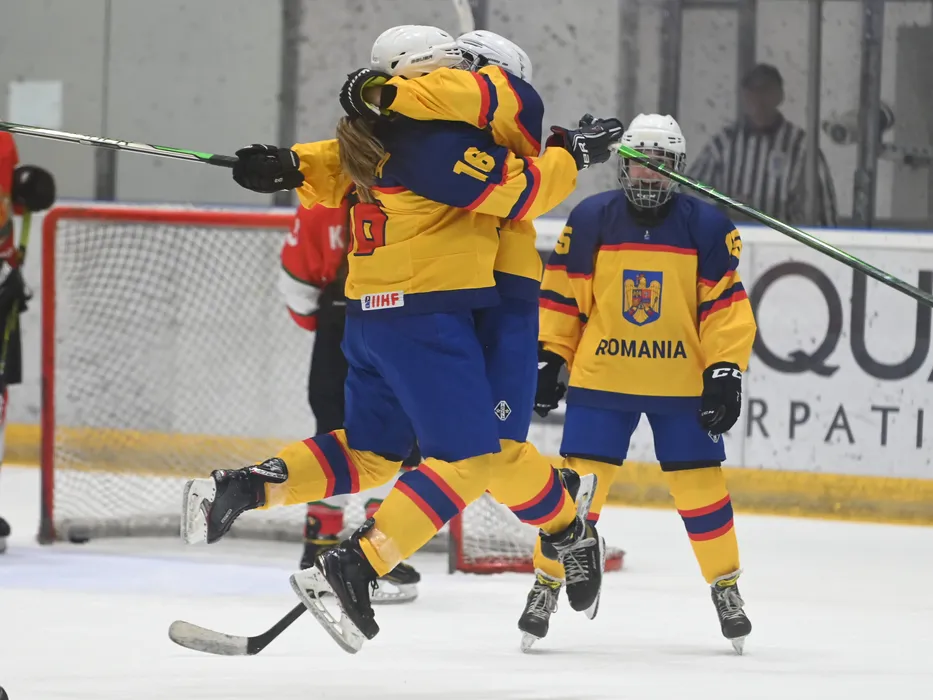 Maissa Simina se bucura dupa un gol marcat alaturi de Alina Oprea in meciul de hochei pe gheata dintre Romania si Bulgaria, din cadrul Campionatului Mondial Feminin, Divizia III, Grupa A, desfasurat pe Patinoarul Olimpic din Brasov, duminica 9 aprilie 2023. © FOTO:Razvan Pasarica/SPORT PICTURES