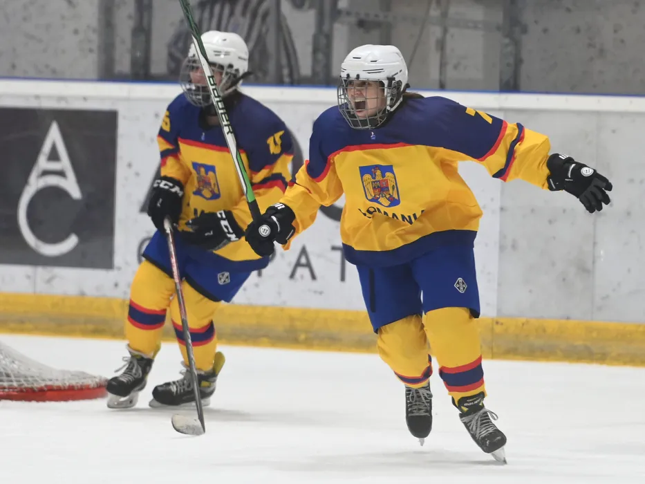 Maissa Simina se bucura dupa un gol marcat in meciul de hochei pe gheata dintre Romania si Bulgaria, din cadrul Campionatului Mondial Feminin, Divizia III, Grupa A, desfasurat pe Patinoarul Olimpic din Brasov, duminica 9 aprilie 2023. © FOTO:Razvan Pasarica/SPORT PICTURES