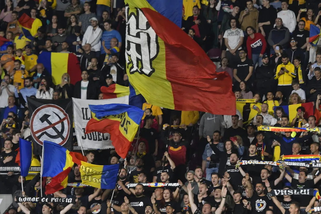 Suporterii romanicu steaguri tricolore isi incurajeaza favoritii la meciul de fotbal dintre Romania si Muntenegru, contand pentru Liga Natiunilor, desfasurat pe Stadionul Rapid Giulesti din Bucuresti, marti 14 iunie 2022. © FOTO:Razvan Pasarica/SPORT PICTURES