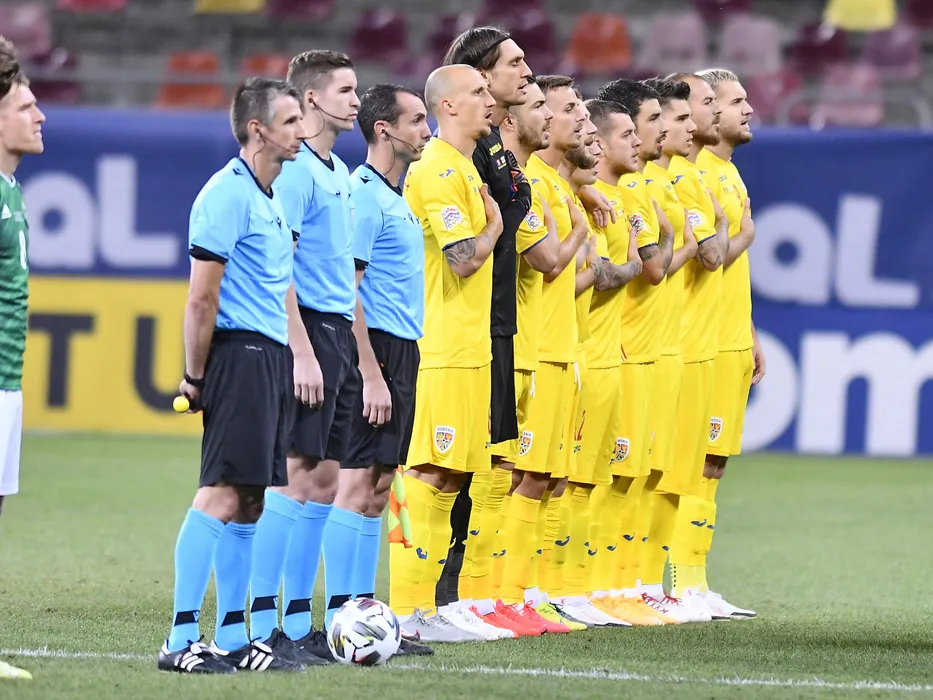 Fotbalistii romani la imn la meciul de fotbal dintre Romania si Irlanda de Nord, contand pentru Liga Natiunilor, desfasurat fara spectatori pe Arena Nationala din Bucuresti, vineri 4 septembrie 2020. © FOTO:Razvan Pasarica/SPORT PICTURES