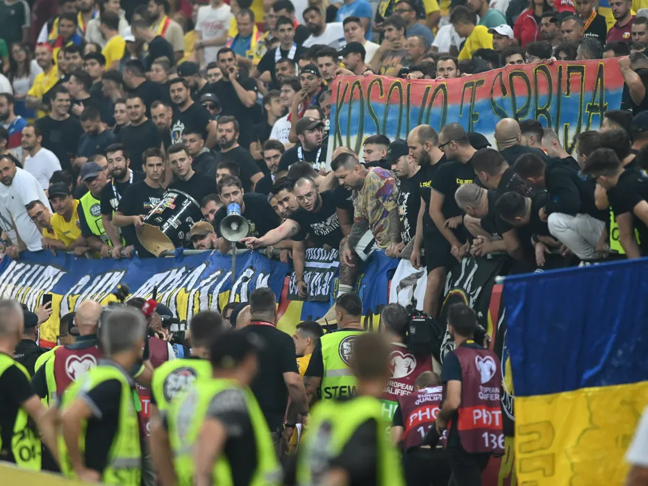 Baner cu mesajul "Kosovo e Serbia" afisat alaturi de Nicolae Stanciu care incearca sa vorbeasca cu galeria la meciul de fotbal dintre Romania si Kosovo, din cadrul preliminariilor Campionatului European 2024, desfasurat pe Arena Nationala, marti 12 septembrie 2023. © FOTO:Razvan Pasarica/SPORT PICTURES
