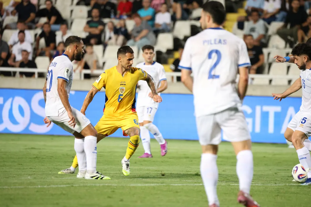 Marius Marin si Grigoris Kastanos in meciul de fotbal dintre Cipru si Romania, contand pentru Preliminariile Campionatului Mondial 2026, desfasurat pe GSP Stadium din Strovolos, marti 9 septembrie 2025. © FOTO:SPORT PICTURES