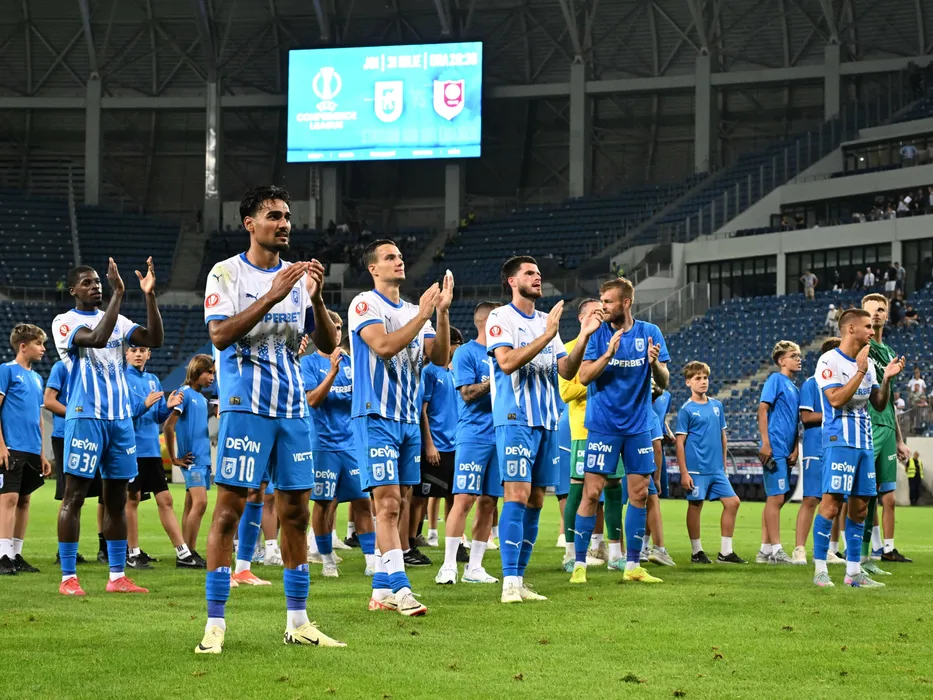 Fotbalistii craioveni Aime Steven Nsasa Nsimba Labe, Stefan Baiaram, Assad Al Islam Al Hamlawi, Tudor Cristian Baluta, Alexandru Cretu, Mihnea Gabriel Radulescu si Pavlo Isenko saluta galeria dupa meciul dintre Universitatea Craiova si Universitatea Cluj, contand pentru Superliga Superbet, desfasurat pe Stadionul Ion Oblemenco din Craiova, luni 28 iulie 2025. © FOTO:Razvan Pasarica/SPORT PICTURES