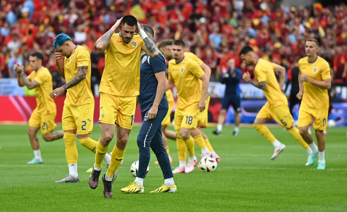 Fotbalistii romani Andrei Burca si Andrei Rațiu la incalzire la meciul de fotbal dintre Belgia si Romania, contand pentru UEFA EURO 2024, desfasurat pe Stadionul Cologne din Koln, sambata 22 iunie 2024. © FOTO:Razvan Pasarica/SPORT PICTURES