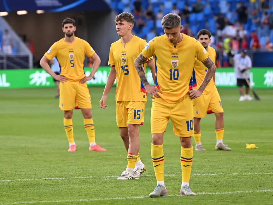Fotbalistii romani printre care Catalin Vulturar reactioneaza dupa meciul de fotbal dintre Spania U21 si Romania U21, din cadrul UEFA EURO U21 din Slovacia, desfasurat pe Stadionul National de fotbal din Bratislava, sambata 14 iunie 2025. © FOTO:Razvan Pasarica/SPORT PICTURES