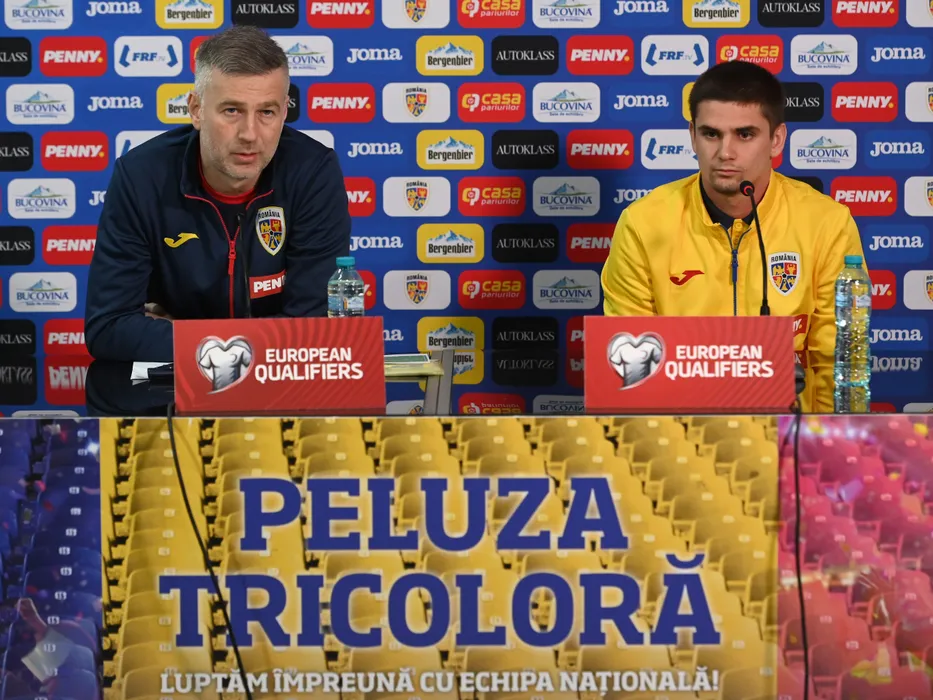 Edward Iordanescu si Razvan Marin la conferinta de presa a Romaniei de dinaintea meciului impotriva Belarus, din cadrul preliminariilor Campionatului European 2024, desfasurata la Centrul National de Fotbal de la Buftea, luni 27 martie 2023. © FOTO:Razvan Pasarica/SPORT PICTURES