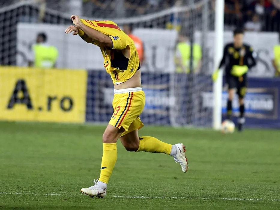 Claudiu Keseru isi schimba tricoul rupt in meciul de fotbal dintre Romania si Malta, din preliminariile C.E. 2020, desfasurat pe Stadionul Ilie Oana din Ploiesti, duminica 8 septembrie 2019. © FOTO:Razvan Pasarica/SPORT PICTURES