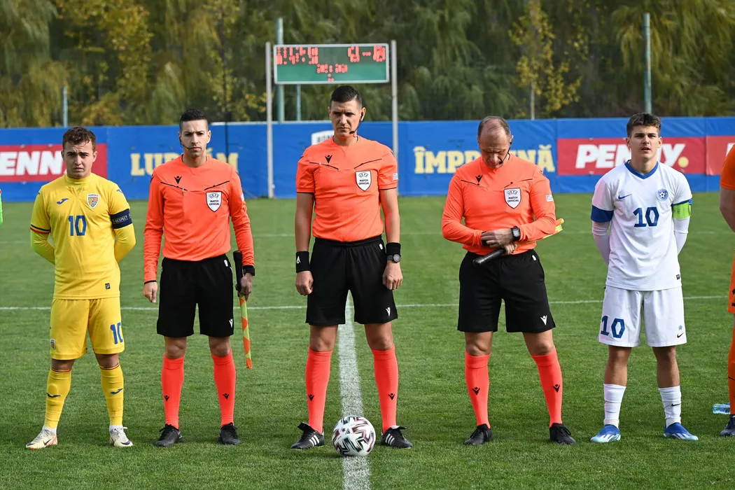 Brigada de arbitri formata din Goce Petreski, Igor Stojchevski si George Kontemeniotis alaturi de capitanii Mihai Vlăduț Toma si Patrik Kristal in meciul de fotbal dintre Romania U17 si Estonia U17, contand pentru Turneul de calificare la Campionatul European 2024, desfasurat la Centrul National de Fotbal de la Buftea, marti 21 noiembrie 2023. © FOTO:Razvan Pasarica/SPORT PICTURES