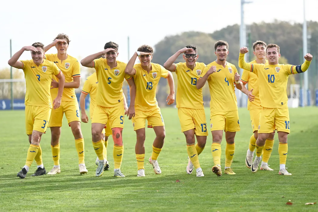 Bucurie a fotbalistilor romani Alin Techereș, Robert Petculescu, David John Dumitra, Vlad Oargă, Narcis Cosmin Ilaș, Matyas Laszlo, Iustin Doicaru si Mihai Vlăduț Toma dupa un gol marcat in meciul de fotbal dintre Romania U17 si Estonia U17, contand pentru Turneul de calificare la Campionatul European 2024, desfasurat la Centrul National de Fotbal de la Buftea, marti 21 noiembrie 2023. © FOTO:Razvan Pasarica/SPORT PICTURES