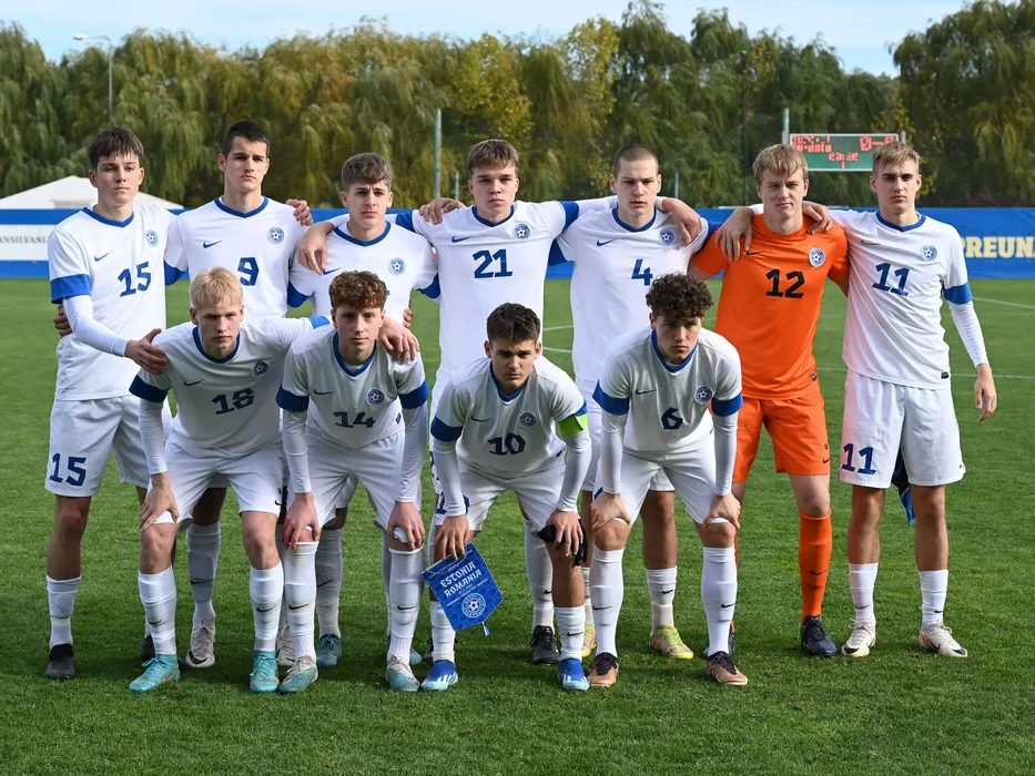 Fotbalistii estonieni la o fotografie de grup realizata inaintea meciului de fotbal dintre Romania U17 si Estonia U17, contand pentru Turneul de calificare la Campionatul European 2024, desfasurat la Centrul National de Fotbal de la Buftea, marti 21 noiembrie 2023. © FOTO:Razvan Pasarica/SPORT PICTURES