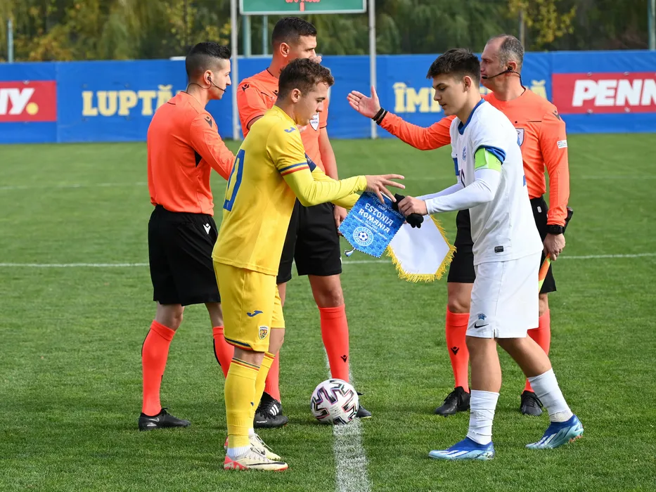 Brigada de arbitri formata din Goce Petreski, Igor Stojchevski si George Kontemeniotis alaturi de capitanii Mihai Vlăduț Toma si Patrik Kristal in meciul de fotbal dintre Romania U17 si Estonia U17, contand pentru Turneul de calificare la Campionatul European 2024, desfasurat la Centrul National de Fotbal de la Buftea, marti 21 noiembrie 2023. © FOTO:Razvan Pasarica/SPORT PICTURES