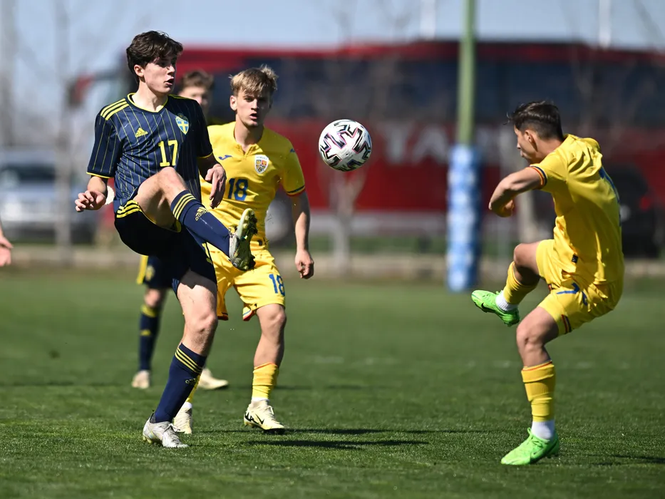Linus Jareteg si Diego Burlacu in meciul de fotbal dintre Romania U17 si Suedia U17, din cadrul Turneului European de Elita 2024, desfasurat la Centrul National de Fotbal de la Buftea, marti 26 martie 2024. © FOTO:Razvan Pasarica/SPORT PICTURES