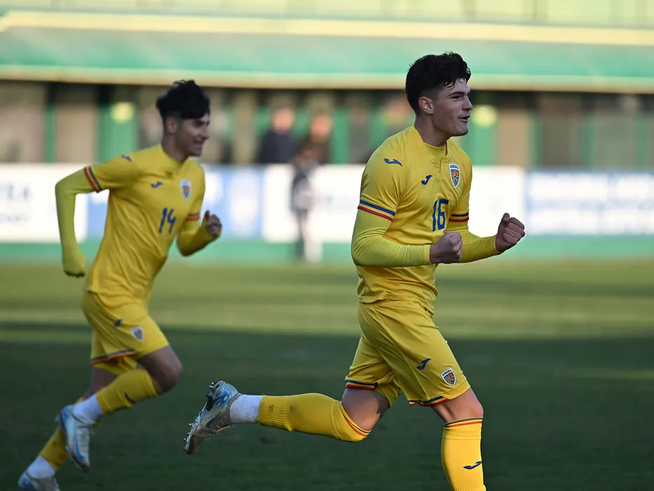 Matei Manolache se bucura dupa un gol marcat in meciul amical de fotbal dintre Romania U18 si Slovacia U18, desfasurat pe Stadionul comunal Concordia din Chiajna, sambata 16 noiembrie 2024. © FOTO:Razvan Pasarica/SPORT PICTURES