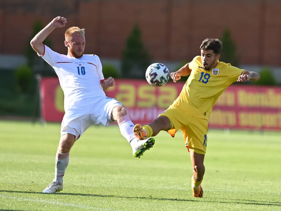 Jáchym Šip si Tony Strata in meciul amical de fotbal dintre Romania U20 si Cehia U20, desfasurat pe Stadionul Eugen Popescu din Targoviste, joi 7 septembrie 2023. © FOTO:Razvan Pasarica/SPORT PICTURES