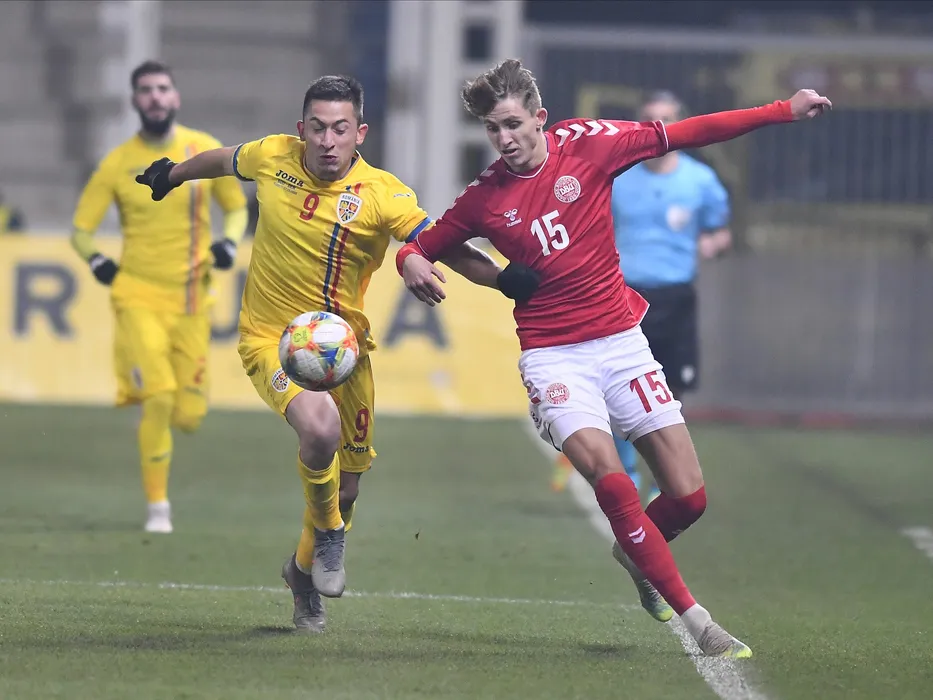 Olimpiu Morutan si Jesper Lindstrom in meciul de fotbal dintre Romania U21 si Danemarca U21, din cadrul Preliminariilor Campionatului European din 2021, desfasurat fara spectatori pe Stadionul Ilie Oana din Ploiesti, marti 17 noiembrie 2020. © FOTO:Razvan Pasarica/SPORT PICTURES