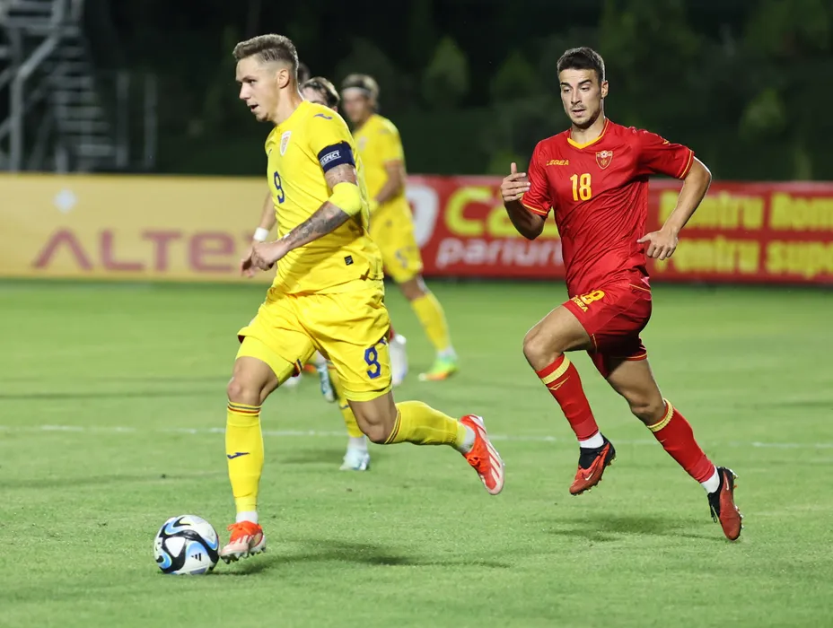 Louis Munteanu și Igor Pajović în meciul de fotbal dintre România U21 și Muntenegru U21, contând pentru Campionatul European U21 EURO 2025, desfășurat pe Stadionul Eugen Popescu din Târgoviște,vineri 6 septembrie 2024. © FOTO: Gică FLUȘTER/SPORT PICTURES