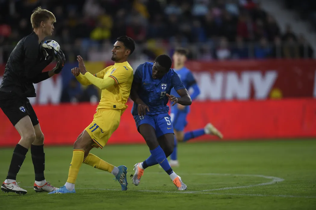 Ștefan Bairam, Lucas Bergstrom și Tony Miettinen în meciul de fotbal dintre ROMÂNIA U21 și FINLANDA U21, contând pentru Campionatul European U21 EURO 2025, desfășurat pe Stadionul Municipal din Sibiu, marți 17 octombrie 2023. © FOTO: Alex NICODIM/SPORT PICTURES
