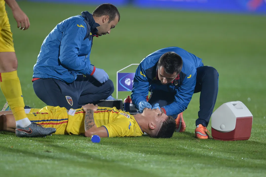 Dennis Man (jos), de la Romania U21, primeste ingrijiri medicale dupa o accidentare, in meciul de fotbal contra selectionatei Irlandei de Nord U21, din preliminariile EURO 2021, disputat pe stadionul Anghel Iordanescu din Voluntari, luni, 14 octombrie 2019. ALEXANDRU DOBRE / MEDIAFAX FOTO