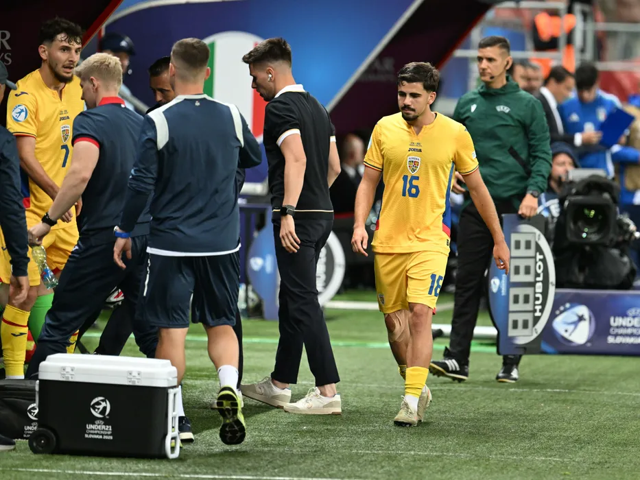 Fotbalistii romani Ianis Stoica si Tony Strata dupa schimbare in meciul de fotbal dintre Italia U21 si Romania U21, din cadrul UEFA EURO U21 2025, desfasurat pe Stadionul Anton Malatinský din Trnava, miercuri 11 iunie 2025. © FOTO:Razvan Pasarica/SPORT PICTURES