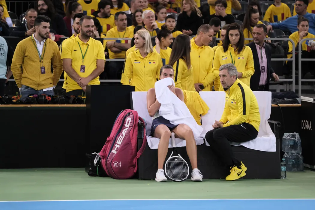 Gabriela Ruse (S) si capitanul nejucator al Romaniei, Florin Segarceanu (D), reactioneaza in timpul meciului de tenis contra sportivei Ekaterina Alexandrova, din cadrul confruntarii dintre Romania si Rusia din play-off-ul Grupei Mondiale a Fed Cup, disputat in Cluj-Napoca, vineri, 7 februarie 2020. RAUL STEF/MEDIAFAX FOTO