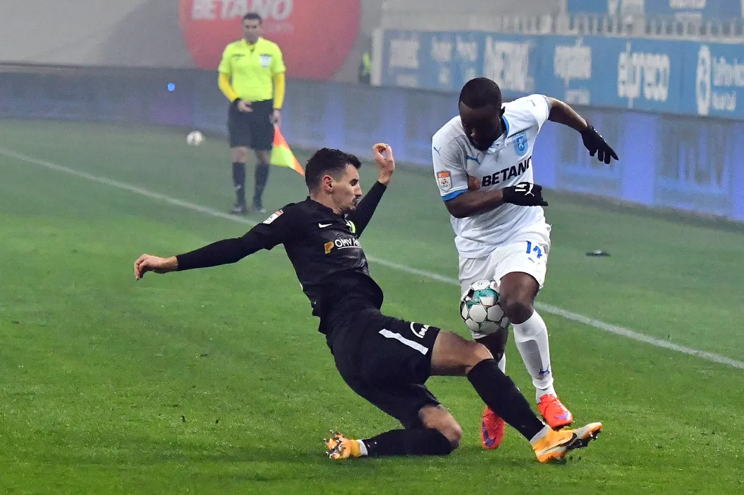 Reagy Ofosu (D), de la Universitatea Craiova, lupta pentru balon cu Romario Benzar (S), de la FC Viitorul, in meciul de fotbal din etapa a XVIII-a a Ligii 1, disputat pe stadionul Ion Oblemenco, sambata, 23 ianuarie 2021. REMUS BADEA/ MEDIAFAX FOTO