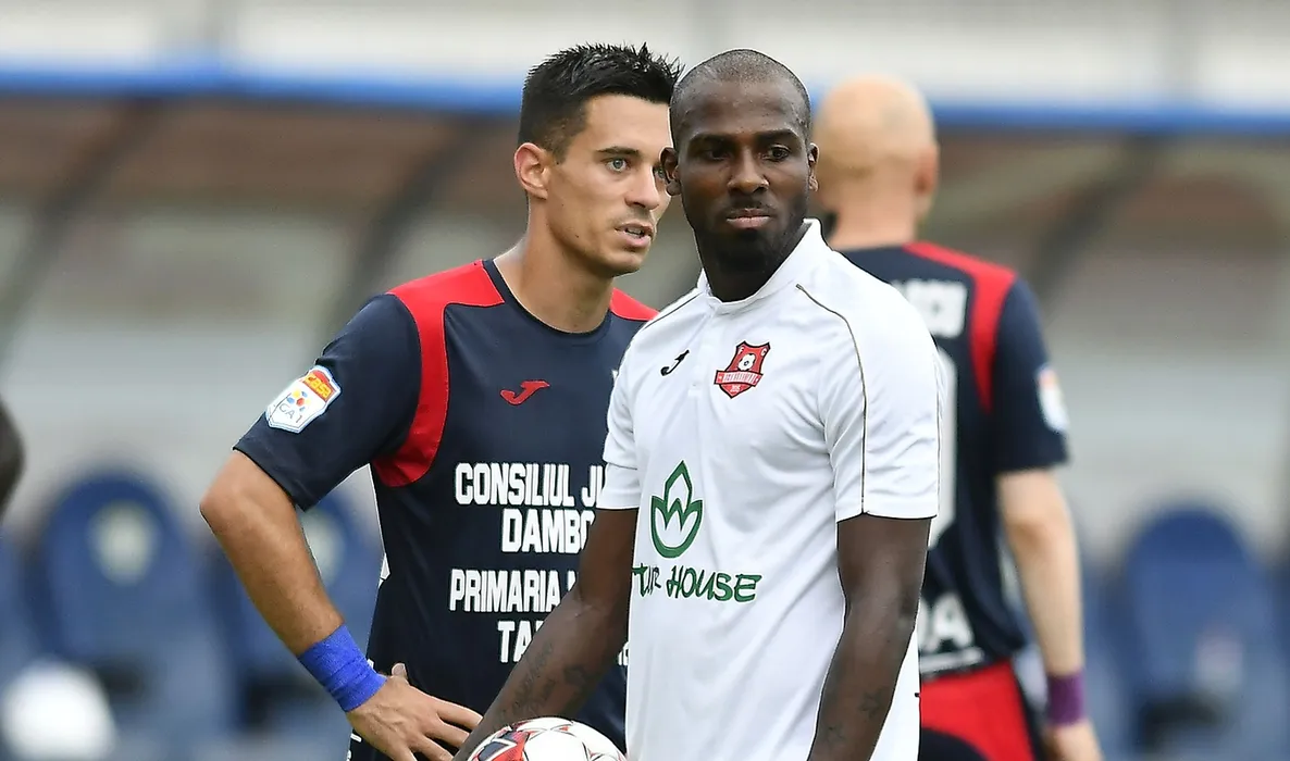Romario Santos Pires si Filip Dangubic in meciul de fotbal dintre Chindia Targoviste si AFC Hermannstadt, contand pentru play-out-ul Ligii 1 Casa Pariurilor, disputat fara spectatori pe Stadionul Ilie Oana din Ploiesti, luni 6 iulie 2020. © FOTO:Razvan Pasarica/SPORT PICTURES