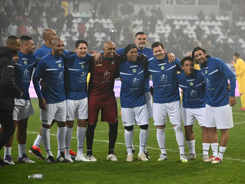 Ronaldinhi si prietenii sai la o fotografie dupa meciul demonstrativ de fotbal dintre Ronaldinho & Friends si Romania, desfasurat pe Stadionul Emil Alexandrescu din Iasi, sambata 29 noiembrie 2025. © FOTO:Tudy/SPORT PICTURES