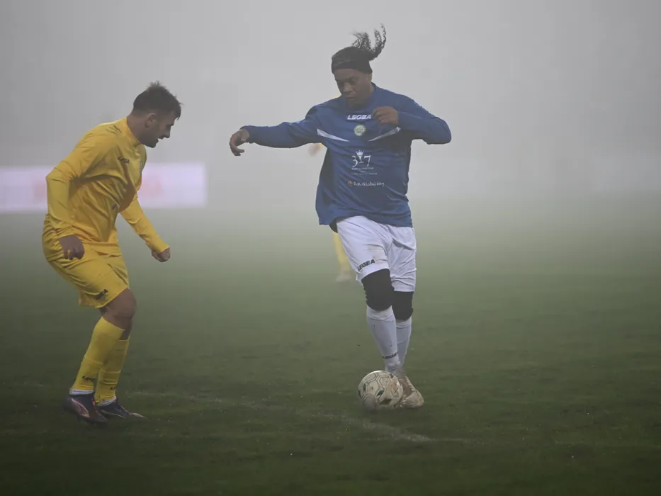 Ronaldinho, în noroi. „Opera de artă” braziliană a ajuns într-o mocirlă asezonată cu ceață, la Iaşi, dar zâmbetul său a rămas la fel de luminos