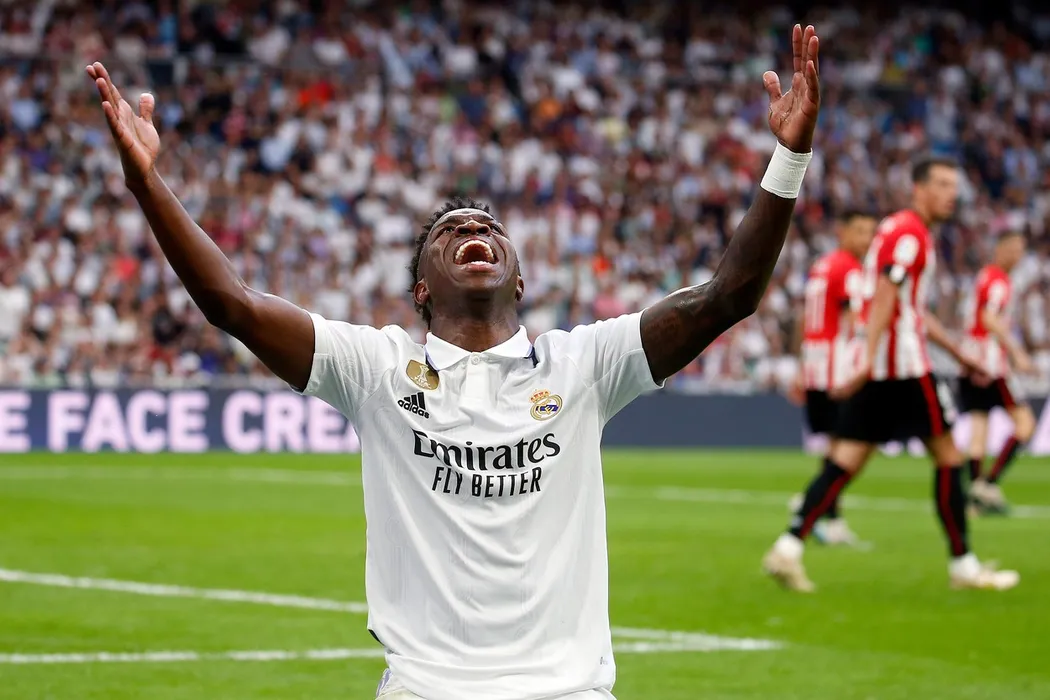 Vinicius Junior of Real Madrid CF reacts during the La Liga match between Real Madrid and Athletic Club played at Santiago Bernabeu Stadium on June 4, 2023 in Madrid, Spain.,Image: 781557219, License: Rights-managed, Restrictions: World Rights Except Japan, Spain, France and The Netherlands * ESPOUT FRAOUT JPNOUT NLDOUT, Model Release: no