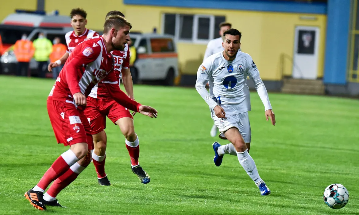 Marco Ehmann si Octavian Ronaldo Andrei Deaconu in meciul de fotbal dintre Gaz Metan Medias si Dinamo Bucuresti, contand pentru Liga 1 Casa Pariurilor, desfasurat fara spectatori pe Stadionul Municipal din Medias, vineri 23 aprilie 2021. © FOTO:Alex Veres/SPORT PICTURES